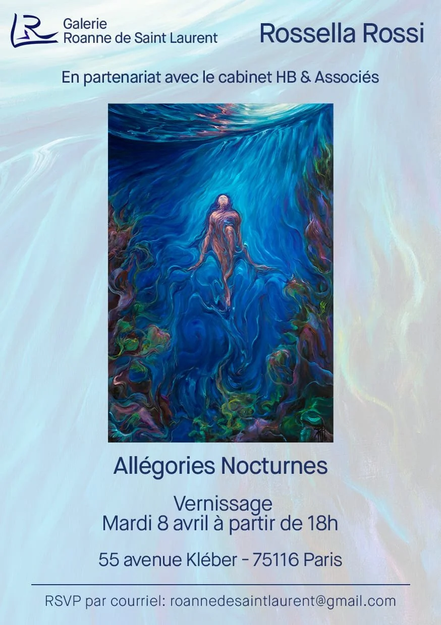 Playing with symbolic colors: ochre for light, blue for water, red for life and green for water, red for life and green for nature, Rossella creates a powerful and telluric art, mixing shadow and bursts of light.