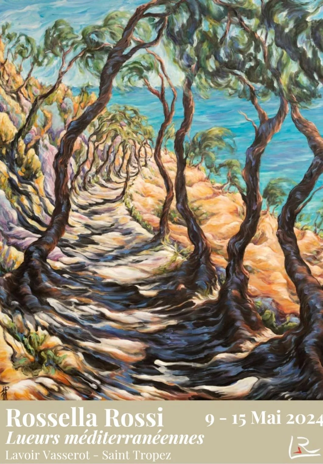Come discover Rossella Rossi's Mediterranean emotions with Lueurs méditerranéennes. Journey into her dreamlike world where colors pulse, trees iridescent, and sky and sea dance in a passionate embrace.