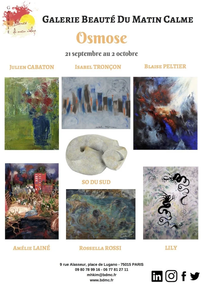 From September 21 to October 2, we invite you to plunge into the artistic blur of “Osmose”, the collective exhibition of the new school year. Six wonderful artists will explore different techniques and media, making us penetrate the world of reflection: with its ripples, luminous refractions, concentric movements, turbulent currents, transparency…