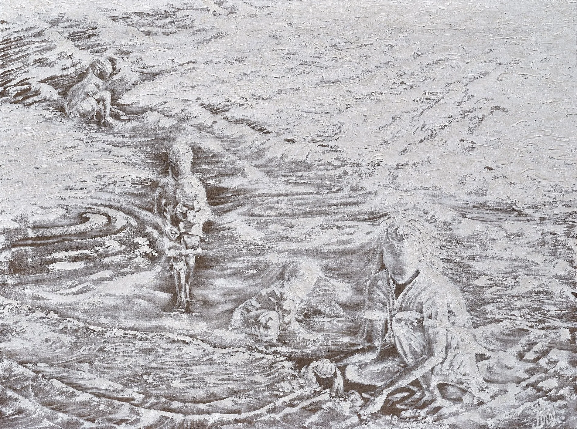 At times, human figures appear within these compositions, blending into the wave-like patterns of foam, evoking a timeless space of purity, contemplation, and dissolution between reality and imagination.